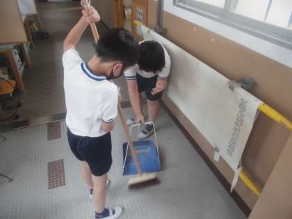 今週からそうじの時間が始まりました。それぞれのそうじ場所に行くと,すのこをどけて細かな所までそうじをしたり,隅々までていねいにそうじをしたりして友達と協力をしながらそうじに取り組んでいました。自分たちの手で学校をきれいにしようとする気持ちがよく伝わり,一生懸命に取り組む姿には関心しました。
