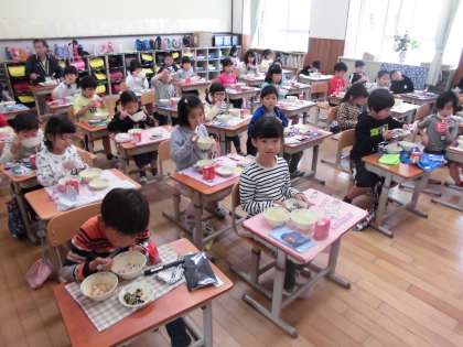 今日のメニューは麦ごはん・牛乳・五目どうふ・ほうれん草ともやしの炒めナムル・じゃこでした。みんなおいしそうにパクパク食べていました。とはいえ黙食です。静かにおしゃべりせずに食べています。これからもいろいろな給食メニューが出てくるので楽しみです。