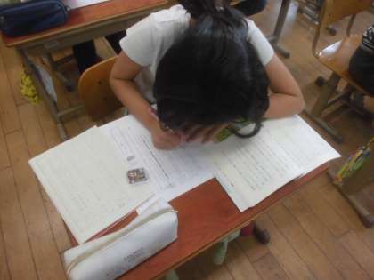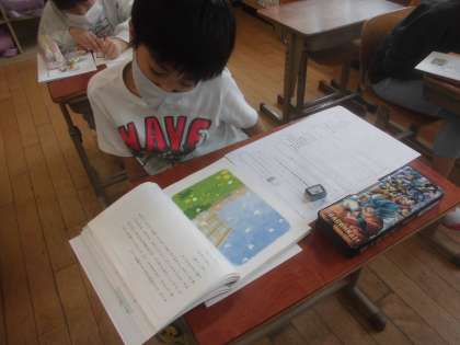 今日は,考えを深めたいことを問いの形にし,自分が立てた問いにつながる場面と場面をつなげて読みました。本文を根拠にしながら集中をして自分の考えを書きまとめていました。