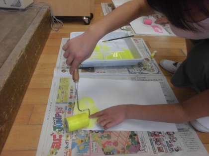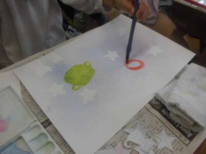 図画工作「絵の具でゆめもよう」では,金網や歯ブラシ,ローラー,段ボールなどの用具を使って,自分のイメージをもとにしながら作品を作りました。かた紙を置いてスパッタリングをした時には,鮮やかな色合いに思わず「きれい」という声があがりました。色や形を工夫しながら楽しそうに活動に取り組んでいました。