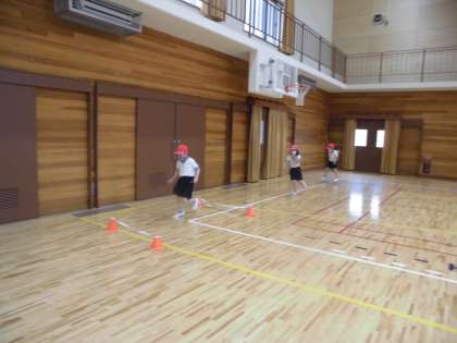 「からだほぐしのうんどう」のなかから,いろいろな走り方を楽しみました。スタートしたらピョンピョンとび,けんぱ,ゴム飛び越えをしてゴールをします。一人3周しました。だんだん上手になりました。