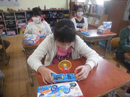 理科「電池のはたらき」の学習が始まりました。今日の学習では,乾電池を使ってモーターを回しました。モーターには,プロペラを付け,そのプロペラがどのように回っているかを観察しました。人によっては,「右から回る」「左から回る」など,回り方が違うことに気付きました。