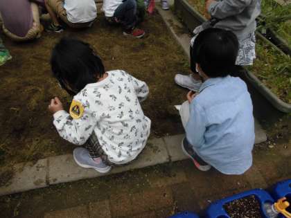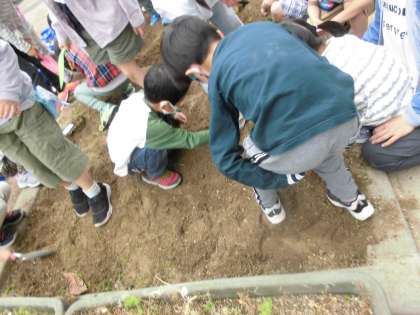 水曜日に,花壇の草引きをして「さつまいも」植えの準備をしました。今日は放課後に地域の方が石灰を入れて土づくりの準備をしてくださいました。さつまいものつるは5月の末ごろに植える予定です。今から楽しみです。 そして,先週に植えたあさがおの種が芽を出しました!1年生のみんなと同じで,すごく元気いっぱいのアサガオです。