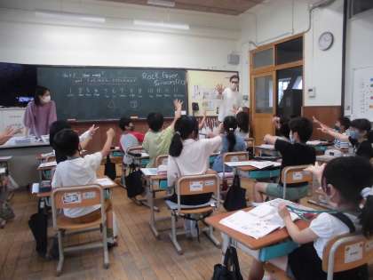 その後は,英語でじゃんけんをしました。子どもたちは「Rock, paper, scissors! 1, 2, 3!」と楽しそうにじゃんけんをしていました。英語で勝った回数を聞かれると,よく聞いて答えることができていました。