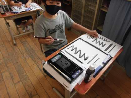 木曜日には,はじめての習字の学習をしました。子どもたちは,書道セットに入っているものを見て,「これは何かな?」と興味津々でした。