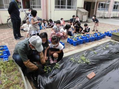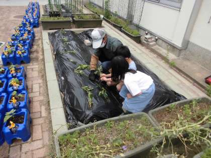 昨日は梅雨の晴れ間ののいい天気でした。地域の方にお世話になり,さつまいもの蔓植えをしました。これから大切に育てていこうね,とみんなで話し合いました。みんなはお世話する気満々でしたが,今日はは大雨で水やりができませんでした。残念だったね。