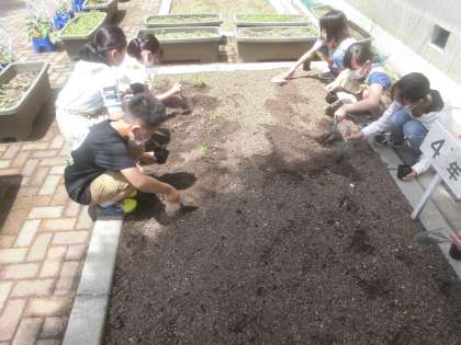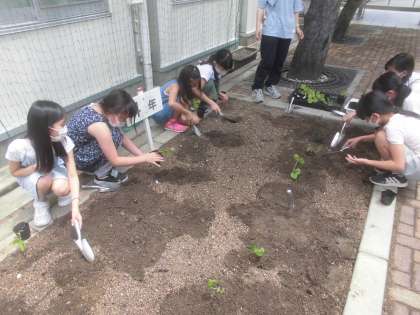 理科の学習では,ポットの中で種から育てていたツルレイシが大きくなってきたので畑に植え替えをしました。ポットからツルレイシを落とさないようにそっと取り出し,畑の土にていねいに植えていました。