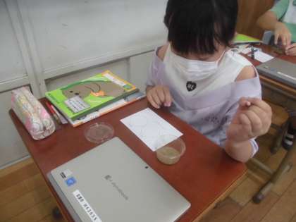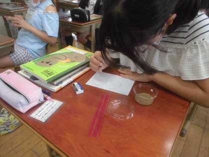 今日の理科の学習は,「校庭の土」と「砂場の砂」の粒の大きさや手ざわりなどを調べました。二つの砂を比べながら気付いたことを集中して書いていました。