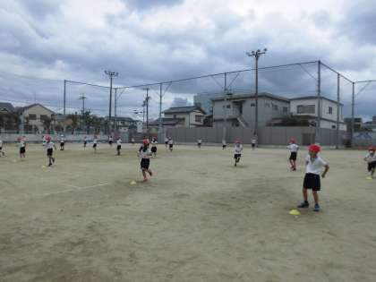 スポーツフェスティバルのダンスの練習です。広い運動場でダイナミックにダンスしています。元気いっぱいのちびっこにんじゃたちです。