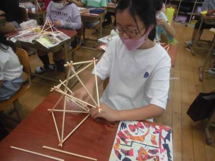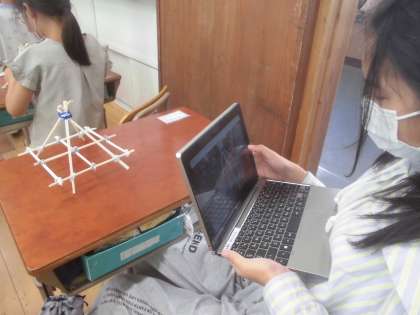 図画工作「つなぐんぐん」の学習では,わりばし,新聞紙などを輪ゴムやモールでつなぎ,思いついたことを工夫しながら作品を作りました。作品を作った後は,GIGA端末で写真を撮り,ロイロノートに提出しました。次は,共有画面で友達の作品を鑑賞します。