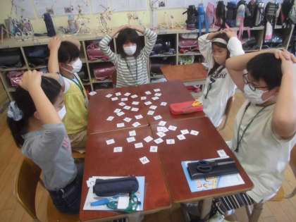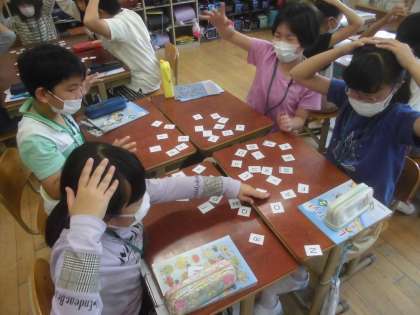 今日の外国語活動は,アルファベットの大文字や小文字を比較しながら,小文字に慣れ親しみました。机の上にアルファベットカードを置き,先生が発音したアルファベットを探し当てるゲームをしました。集中をし,しっかりと聞き取りながら楽しんでいました。
