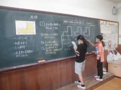 算数科「面積」では,図形の面積を色々な方法で求めました。「図形にたて線や横線を書くと長方形や正方形の形になる」「大きな長方形として考えてから求めることができる」などのように工夫をしながら面積を求めることができました。