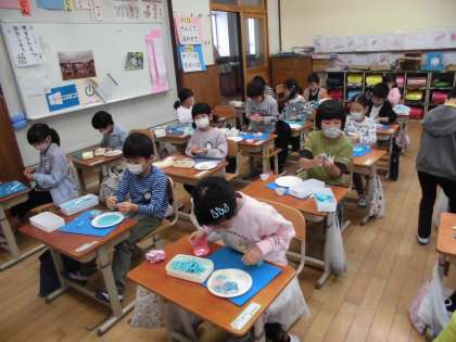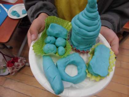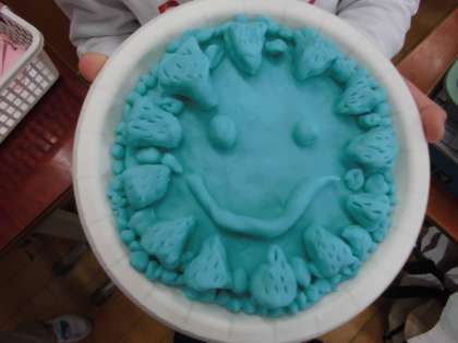「ごちそう パーティー はじめよう!」をしました。粘土でごちそうを作りました。みんなとってもおいしそうです。廊下に飾って,パーティーの始まりです。