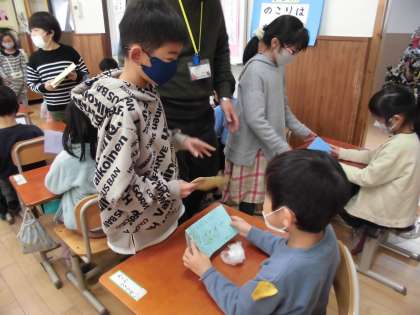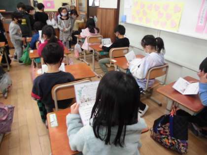 明日は2年生が生活科で取り組んできた「ためして あそんで くふうして」のあそび大会に招待してくれます。その招待状を今日持ってきてくれました。みんなとっても嬉しくて真剣に見入っていました。明日がとっても楽しみです。