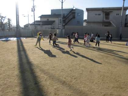 「ふゆとともだち」をしました。まずは影ふみおにです。冬は影が長くなるので影ふみおににはぴったりの季節です。疲れたら,ポールや校舎の影に隠れて一休みです。