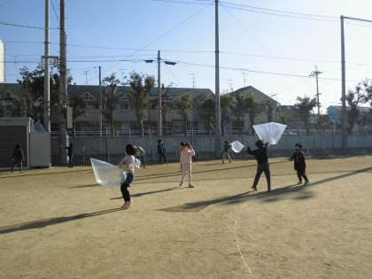 次は,風と遊びました。大きなビニール袋に風をいっぱい集めました。今日は風が弱かったので2人1組になって思いっきり走りました。その後は袋の口を縛って風船あそびをしました。ふゆとともだちになれたかな。