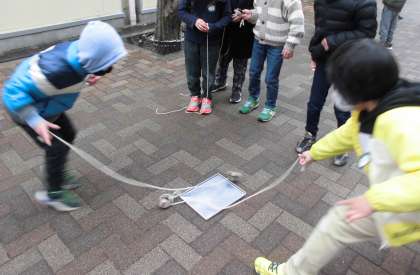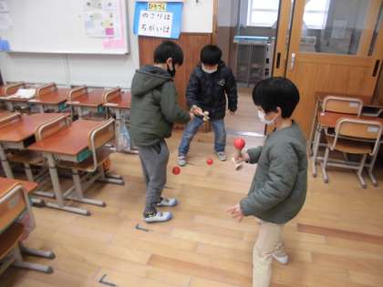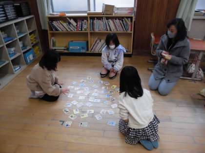 「ふゆとともだち」の学習で,昔から伝わる伝統的なあそびをしました。西大路小学校には遊び道具がたくさんあります。けん玉・コマ・めんこ・カルタ・凧・竹トンボ・羽子板・おはじき・お手玉等々。今日はけん玉・コマ・めんこ・かるたをしました。遊び方がわからなかったり,うまくできなかったものもありましたが,みんなで仲良くできました。