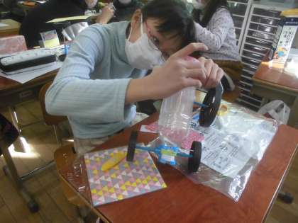 図画工作「ゴーゴードリームカー!」では,ペットボトルや空き箱を使って動く車を作っています。それぞれが作品のイメージをしっかりともって作品作りに取り組んでいます。どのような作品になるかが楽しみです。