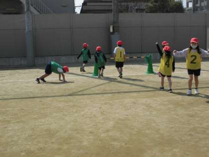 ボールけりゲームが始まりました。まず,チームごとにボールをける練習をしました。そしてゲームをしました。難しかったけどみんな頑張りました。