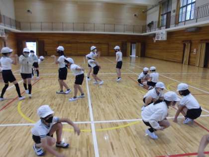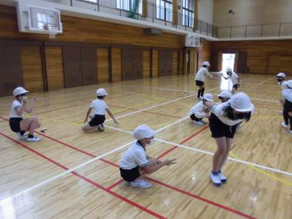 「体ほぐしの運動」をしました。まずは「にわとりじゃんけん」です。みんな楽しそうでした。他にも「猛獣がり」「やまあらし」「ねことねずみ」 等たくさん体ほぐしの運動をしました。