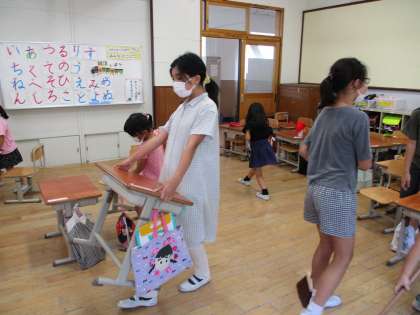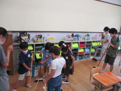 6年生は,1年生の教室のそうじを手伝いながらほうきの持ち方やそうじの仕方などを1年生の友達に教えています。今週のそうじ担当の6年生は,自分たちと同じ動きをするように1年生に声をかけてそうじをしていました。それぞれの当番によって工夫をしながら教えています。