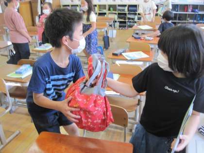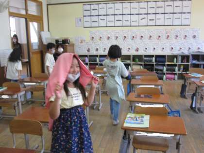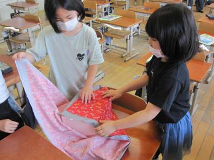 休み時間にみんなでふろしきを触ってどんな使い方ができるか