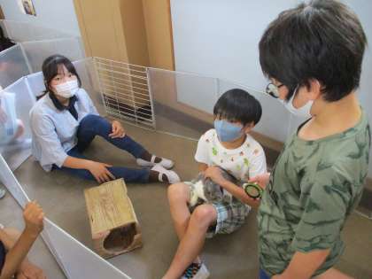 今日の休み時間は,飼育委員会の友達と一緒にうさぎと触れ合っていました。うさぎと触れ合うことができるように場を作り,その中に入ってうさぎと遊んでいました。うさぎをやさしく撫でたり,ひざの上に乗せたりして動物に癒されていました。
