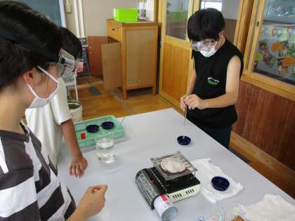 理科の学習では、水溶液の性質について調べています。炭酸水、塩酸、石灰水などの水溶液を蒸発皿に少量とって熱し、何が残るかを調べました。実験では、見た目・におい・熱した後などをワークシートに記録しました。火を扱う実験でしたが5年生での学習を生かしながら安全に実験を進めることができました。