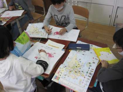 地図帳を使って世界地図に印をつけながら調べました。