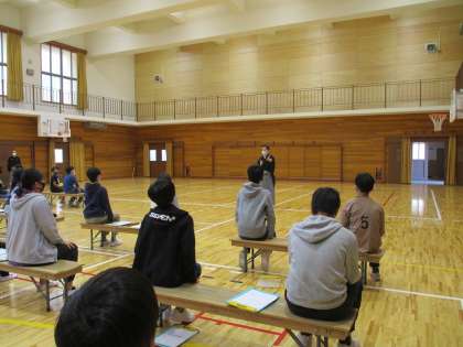 総合のはばたき学習で狂言の体験学習をしました。狂言の先生に来校して頂き、狂言の歴史についてお話を聞いたり、柿山伏を演じたりして頂きました。実際に演じてもらうと迫力があり、所作もじっくりと見ることができました。その後、笑い方やセリフの言い方を教えて頂きながら体験をしました。最後には、質問コーナーを設けていましたが学習が終わっても聞き足りなかった質問を積極的にしていました。