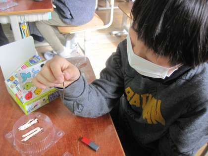 磁石からはなしても、釘と釘が付いていることにびっくりしていました。