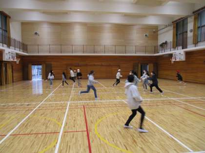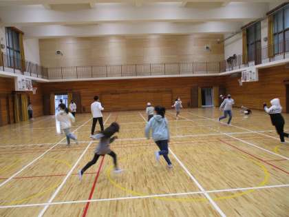 運動安全委員会主催のみんな遊びがありました。今日の遊びは、「ゾーンおにごっこ」でした。1分ごとに逃げる範囲が狭くなっていくという遊びです。おにから必死に逃げようと一生懸命、走って体を動かしていました。