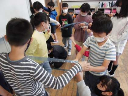 5年の算数科では、体積についての学習を進めています。今日は、量感を把握するために、テープを使って1立方メートルを表現しました。「思ったよりも大きいね」「1立方センチメートルが100万個集まると1立方メートルになるとは知っていたけど、本当にそれくらい必要なんだな」と実感することができていました。
