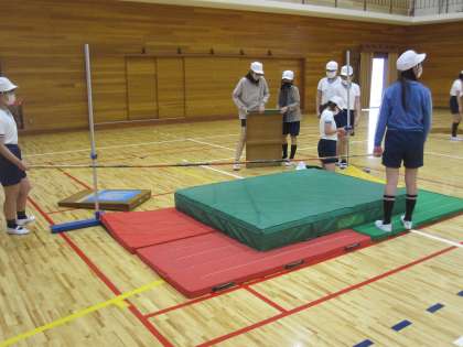 みんなで協力して走り高跳びの用具を準備しています。