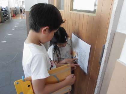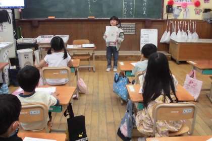 昨日、子どもたちがとても楽しみにしていた学校探検をしました。2年生との「なかよしペア」で、学校の様々な教室をまわりました。「音楽室に楽器がいっぱいあった。」「黒板も教室のものと違ったよ。」「保育園より、ずっとずうっと大きなプールだった!」「理科室で人体模型を見たで!」など、子どもたちは発見したことをたくさん教えてくれました。2年生のお兄さんお姉さんともたくさんお話しして、嬉しそうでした。
