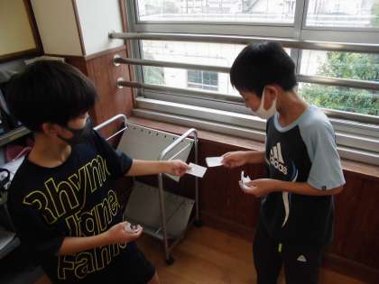 5年の外国語では、学習した表現を使った名刺交換にチャレンジしました。「How do you spell it?」や「What sport do you like?」といった言葉でやりとりするだけでなく、「Really? Me too.」のように、相手の言葉を受けての反応もしながら会話することができていました。