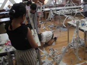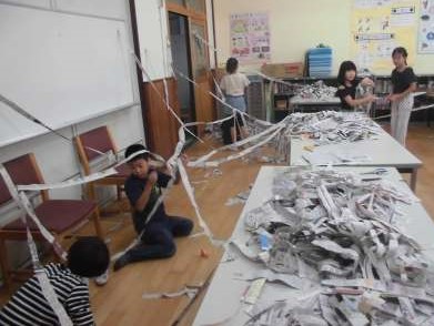 「つないで つるして」をランチルームで行いました。教室より少し広くて、広いテーブルや安全で上りやすいところもあるので、活動しやすかったです。細く切った新聞紙をセロハンテープで長くつないで、壁に養生テープで貼ってつるしました。みんなの作品がつながると、まるでクモの巣迷路みたいでした。とっても楽しかったです。
