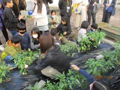 JA宮崎経済連の方や宮崎県の担当の方、京果グループの方、3年生保護者の皆様に来ていただき、はばたき学習で育ててきたピーマンの収穫を行いました。