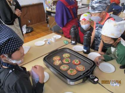 収穫後、家庭科室でピザを作って食べました。来てくださった方やお家の人にも食べていただき、子どもたちは「おいしいって言ってくれて嬉しかった。」と言っていました。