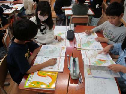 社会科の学習では、京都府の交通の様子と人口の分布図や地形の様子などの資料を比べながら気付いたことを話し合いました。資料を指しながら自分たちの考えを相手に伝える中で、新たな考えに気付くことができました。