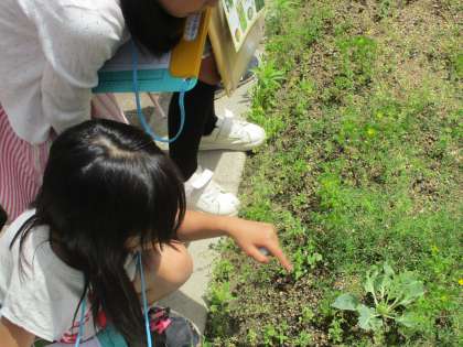 「これなんやろう?」「モンシロチョウの幼虫やで!」と話し合っていました。