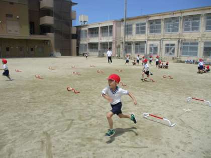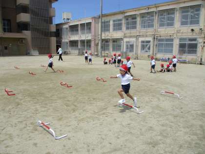 体育科では、「リレーあそび」の学習をしています。今日は、ミニハードルを飛び越える「ぴょんぴょんリレー」をしました。走る前には、「走るときには、腕を振ると速く走れます」「足を速く動かすことも大切です」といった意見もあり、速く走るためにどうすればいいかを考えることができていました。