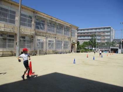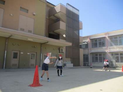 体育科「遠投」の学習では、ボールを遠く投げるために腕を最後まで振り切ることやボールを手から離すタイミングを考えながら練習しています。技術を伸ばすだけでなく、グループでボールを投げる人、計測する人など、役割分担をしながらよいチームワークで練習に取り組む姿もとてもよかったです。