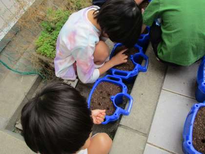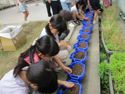 今日、一年生はあさがおの種をまきました。ふかふかの土をうえきばちに入れ、やさしく種をまきました。「何色の花がさくのかな。」「元気に大きくなってね。」と種に声をかけながら、まいていました。