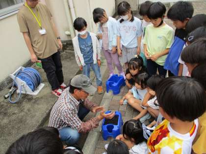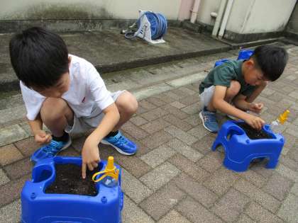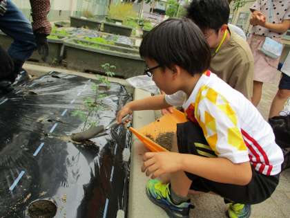 生活科の学習で、ミニトマトと枝豆を育てることにしました。畑にはミニトマトの苗を植え、自分の鉢には枝豆の種をまきました。地域の方に「畑の先生」としてご協力をいただき、アドバイスをいただきながら植えました。子どもたちは、「水はどれくらいあげたらいいのですか。」「もし虫が来たり、病気になったりしたら…。」と、興味津々でたくさん質問をしていました。自分たちでも調べようと、図書館で本も借りてきました。「おいしい野菜を育てるぞ!」「枝豆の芽はどんな形かな?」と、とってもワクワクしています。