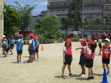 3年生は4年生にお手本をを見せてもらい、4年生はメイトのお兄さん・お姉さんとして張り切って3年生にバトンパスのコツを教えていました。