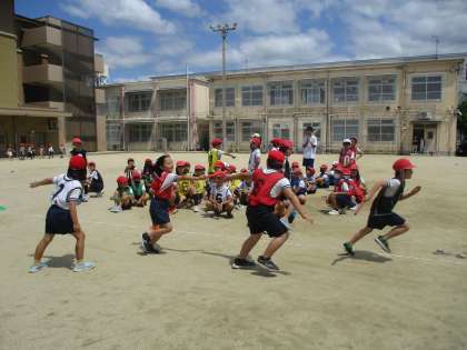 体育では、3・4年生合同でメイトリレーを進めています。今日は、それぞれのチームでタイムを計測しました。1回目のタイムを上回ることができるようにバトンパスの練習をしました。チャレンジ体験で来ている中学校のお兄さんやお姉さんたちからもアドバイスをもらっていました。2回目のタイムでは、少しだけでしたが1回目のタイムよりも上回っているチームがありました。バトンパスも上手になり、チームワークも高まっています。