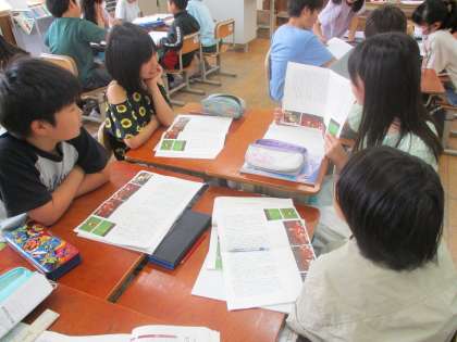 国語科「アップとルーズで伝える」では、全文シートを使って、組み立てや内容を確かめ、「中」でどのように説明されているのかを読み、分かったことや考えたことを友達と話し合っています。本文を根拠としながらがんばって自分の考えを伝えています。