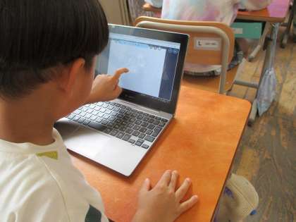 1年生は、初めてロイロノートを使いました。今日は、好きな果物の絵を描いて、提出箱に入れるという操作まで行いました。子どもたちは画面を見ながら、「ここを押すと色が変えられるよ。」「やり直しができていいね。」と考えて操作することができていました。
