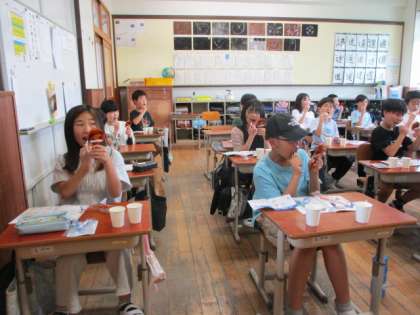 映像を見ながら、きれいな歯や口の状態について考えた後、自分の口の中の様子を観察しました
